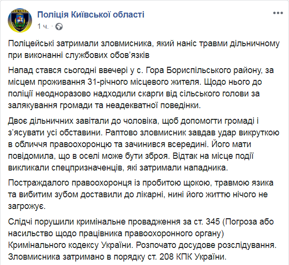 Нападение произошло 9 января вечером в селе Гора Бориспольского района. К 31-летнему местному жителю наведались двое участковых, так как в полицию неоднократно поступали жалобы от сельского головы по поводу того, что мужчина запугивает людей и неадекватно себя ведет.