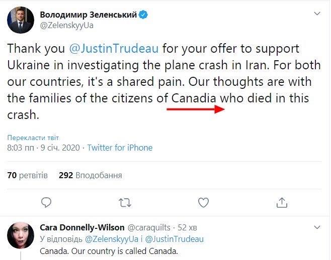 Владимир Зеленский сделал в соцсети запись на английском о том, что премьер-министр Канады Джастин Трюдо предложил Украине помощь в расследовании крушения самолета МАУ в Иране и назвал Канаду Канадией. Ошибку президент (точнее, скорее его пресс-служба) допустил в Twitter.