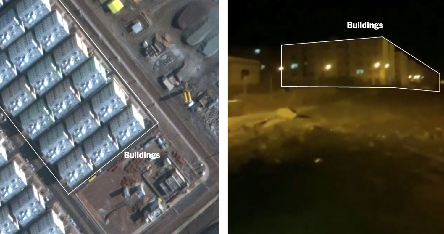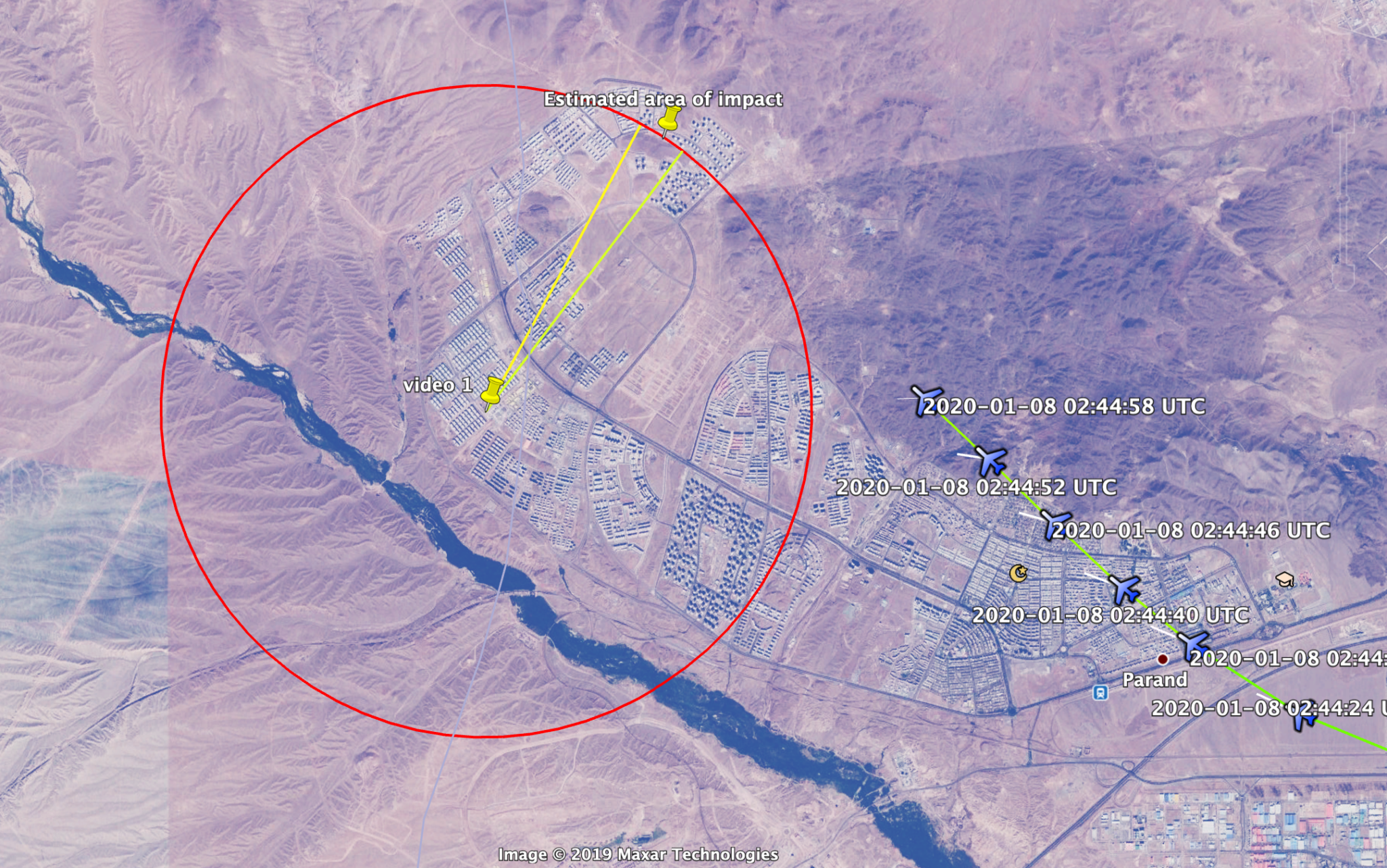 "Камера направлена на северо-восток, в направлении траектории полета PS752. Различные объекты на видео можно заметить на имеющихся в открытом доступе спутниковых снимках, в том числе линию многоквартирных домов, фонарные столбы и строительную площадку слева от точки съемки. На новом снимке, опубликованном Terraserver 15 ноября 2019 года (не приводится в этой статье из соображений интеллектуальной собственности) наблюдаемые на видео небольшие здания уже построены, а их положение совпадает с кадрами видео", - сообщают в Bellingscat.