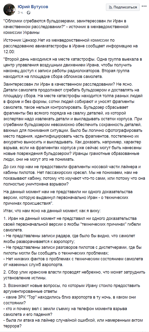 "Второй день находимся на месте катастрофы. Одна группа выехала в центр управления воздушным движением Ирана, чтобы получить наконец доступ к записи работы радиолокаторов. Вторая группа находится на площадке сбора обломков самолета... Детали самолета продолжают сгребать бульдозером и доставлять на площадку сбора. На месте катастрофы находится толпа разных людей в форме и без формы, сотни людей собирают и уносят фрагменты самолета, такое нельзя контролировать", - цитирует автор поста свой источник.