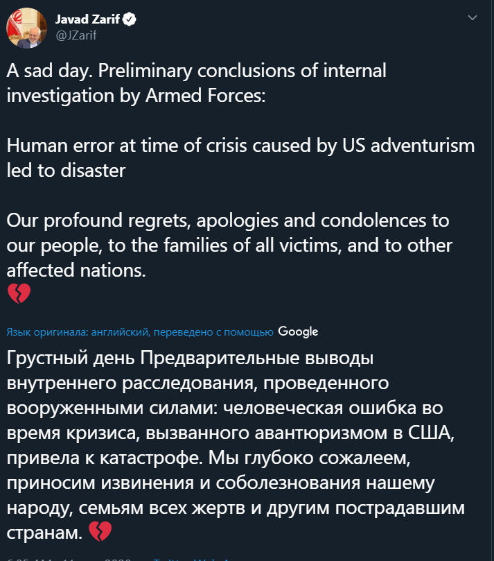 "Печальный день. Предварительные выводы внутреннего расследования, проведенного вооруженными силами: человеческая ошибка во время кризиса, вызванного авантюризмом в США, привела к катастрофе. Мы глубоко сожалеем, приносим извинения и соболезнования нашему народу, семьям всех жертв и другим пострадавшим странам", - написал Зариф.