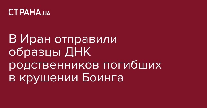 Министерство внутренних дел Украины (МВД) передало в столице Ирана - Тегеран - ДНК-образцы родственников украинцев, которые погибли в результате крушения самолета Boeing 737 авиакомпании "Международные авиалинии Украины" (МАУ), который сбили ПВО Ирана. Министерство ожидает от иранской стороны идентификации тел погибших и возвращения их в Киев. Об этом сообщает пресс-служба МВД в субботу утром.