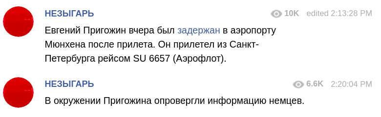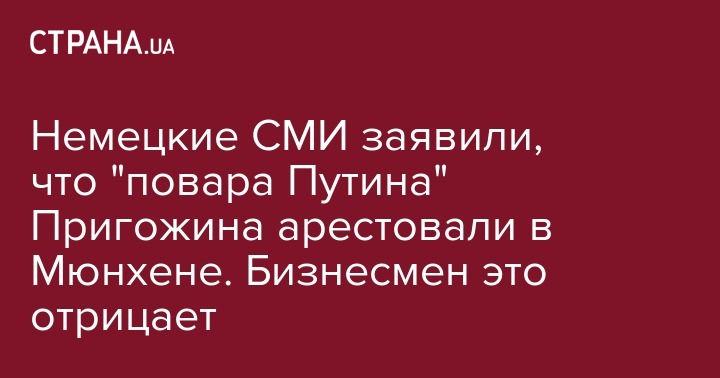 Однако, Telegram-канал "НЕЗЫГАРЬ" пишет о том, что в окружении Пригожина опровергли информацию немцев относительно задержания бизнесмена.
