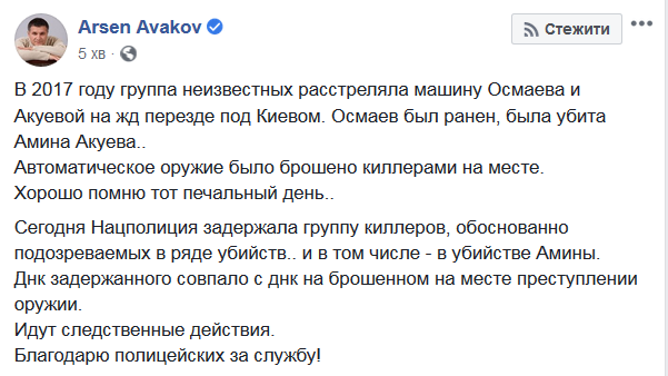 Сегодня Нацполиция задержала группу киллеров, обоснованно подозреваемых в ряде убийств и в том числе - в убийстве Амины. ДНК задержанного совпало с ДНК на брошенном на месте преступлении оружии. Идут следственные действия. Благодарю полицейских за службу!", - написал Аваков.