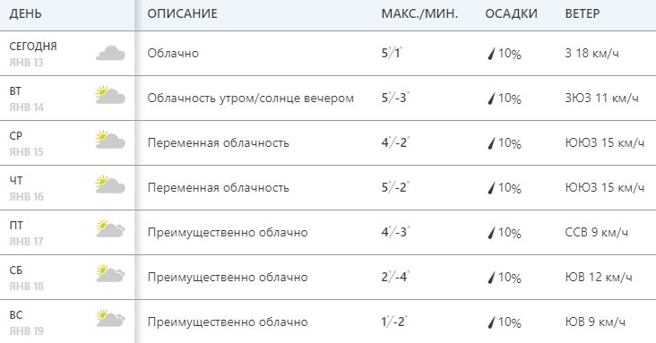 Ресурс Weather.com сообщает о переменной облачности на протяжении всей недели, но без осадков. Температура днем +4...+5, на выходных чуть холоднее +1...+2. Ночная температура от -2...-4.