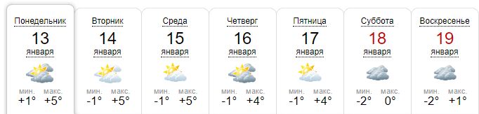 По данным Gismeteo, с понедельника по пятницу включительно в Киеве днем +3...+5. Ночью +1...-2. На выходных, 18-19 января, днем -1...-2, ночью до -3. Во вторник, 14 января, и в четверг, 16 января, возможен дождь.