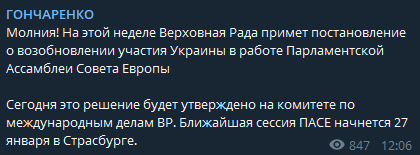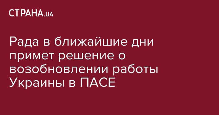 Верховная Рада на этой пленарной неделе примет постановление о возобновлении участия Украины в работе Парламентской Ассамблеи Совета Европы. Об этом сообщает нардеп Европейской солидарности Алексей Гончаренко.