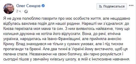 "Я не очень люблю говорить о моей личной жизни, но недавно произошло важное событие для нашей семьи. Наконец-то, мы воссоединились: в Киев переехала моя мама и сын", - сообщил Олег Сенцов.