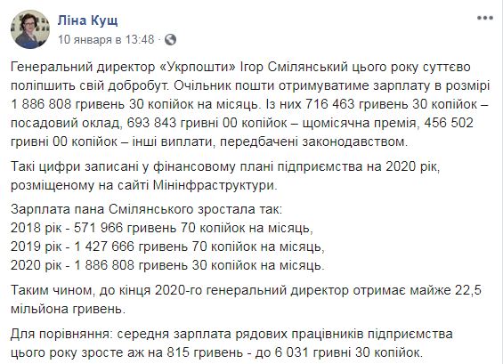 "Генеральный директор "Укрпочты" Игорь Смелянский в этом году существенно улучшит свое благосостояние. Глава почты получать зарплату в размере 1 886 808 гривен 30 копеек в месяц. Из них 716 463 гривен 30 копеек - должностной оклад, 693 843 гривны 00 копеек - ежемесячная премия, 456 502 гривны 00 копеек - другие выплаты, предусмотренные законодательством", - говорится в сообщении Кущ.