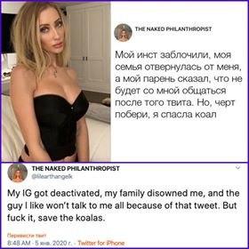 "Мой Инстаграм заблокировали, моя семья отвернулась от меня, в мой парень сказал, что не будет со мной общаться, после того твита, но, черт побери, я спасла коал",- написала она в Твиттере.