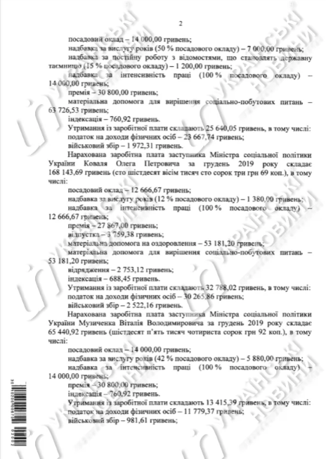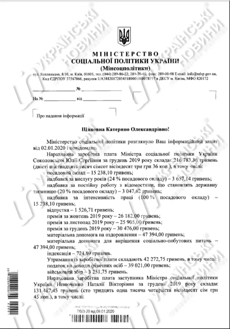 Зарплата заместителя министра Наталии Ненюченко составила 131 487 гривен (в частности, премия – 30 800 гривен и помощь на решение социально-бытовых проблем – 63 726 гривен), замов Олега Коваля – 168 144 гривны (премия – 27 867 гривен, помощь на оздоровление – 53 181 гривна и помощь на решение социально-бытовых проблем – 53 181 гривна), Виталия Музыченко – 65 441 гривна (30 800 гривен – премия), зарплата замминистра соцполитики по евроинтеграции Сергея Нижинского составила 166 842 гривны (премия – 30 800 гривен и помощь на оздоровление 50 376 гривен и на решение социально-бытовых проблем – 50 376 гривен) и госсекретаря Елены Богачовой с 10 по 31 декабря – 60 366 гривен.