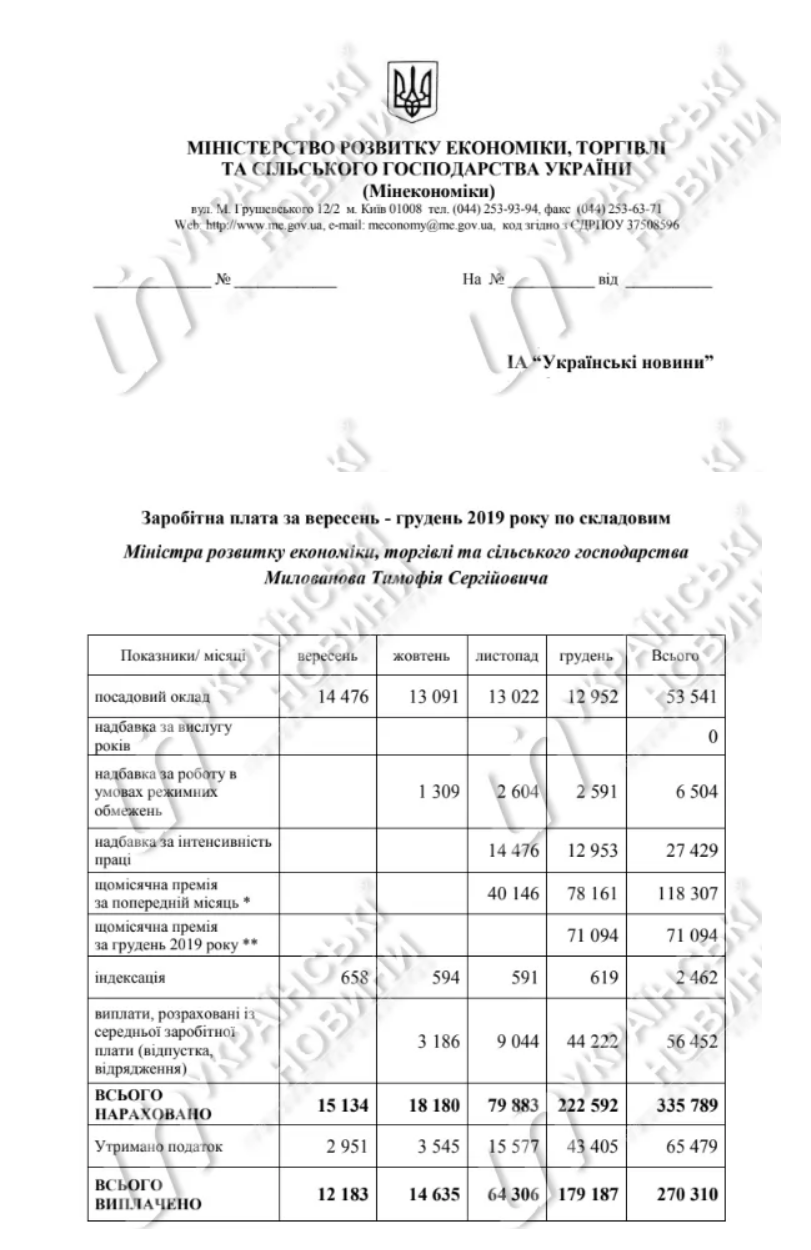 Кроме того, агентство приводит зарплаты за декабрь других топ-чиновников из министерства, возглавляемого Миловановым. Так, его первому заместителю Павлу Кухте начислили 288 772 гривны (в том числе премию за ноябрь 124 500 гривен и за декабрь 106 857 гривен).
