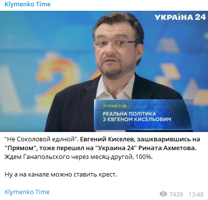 "Не Соколовой единой. Евгений Киселев, зашкварившись на "Прямом", тоже перешел на "Украина 24" Рината Ахметова. Ждем Ганапольского через месяц-второй, 100%", – говорится в сообщении.