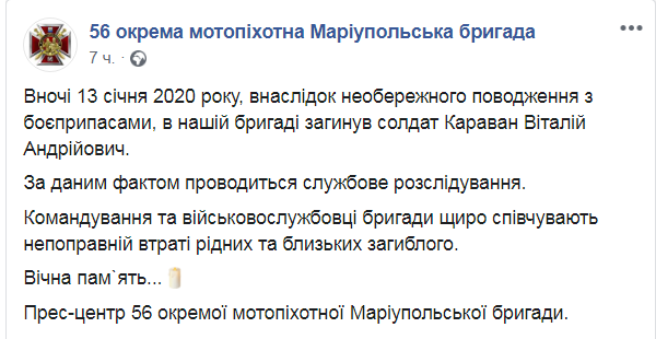 В результате неосторожного обращения с боеприпасами ночью 13 января в 56-й отдельной мотопехотной Мариупольской бригаде погиб солдат. Об этом в Facebook сообщает пресс-центр бригады.