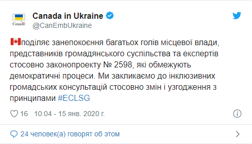 "Канада разделяет обеспокоенность многих глав местной власти, представителей гражданского общества и экспертов по законопроекту № 2598, которые ограничивают демократические процессы. Мы призываем к инклюзивным общественным консультациям относительно изменений и согласования с принципами Европейской хартии местного самоуправления", - отметили в посольстве Канады.