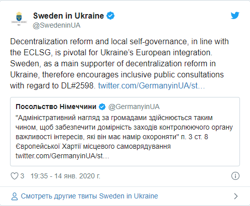 "Реформа децентрализации и местного самоуправления в соответствии с Европейской хартией местного самоуправления является ключевой для европейской интеграции Украины. Швеция как главный сторонник реформы децентрализации в Украине поощряет проведение всеобъемлющих общественных консультаций по проекту №2598", - говорится в сообщении посольства.