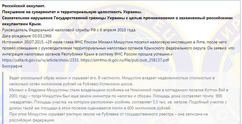 В основании для внесения в базу на сайте сообщается, что Мишустин "сознательно нарушал государственную границу Украины" с целью проникновения в Крым.