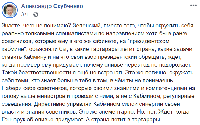 "Знаете, чего не понимаю? Зеленский, вместо того, чтобы окружить себя реально толковыми специалистами по направлениям хотя бы в ранге советников, которые ему в его же кабинете, на "президентском кабмине", объясняли бы, в какие тартарары летит страна, какие задачи ставить Кабмину и на что свой взор президентский обращать, ждёт, когда премьер ему придумает, почему оливье через год не подорожает. Такой безответственности я ещё не встречал. Это же логично: окружать себя теми, кто знает больше тебя в том, в чём ты не понимаешь. Набери себе советников, которые своими знаниями и компетенциями на голову выше министров и проводи с ними, а не с Кабмином, регулярные совещания. Директивно управляй Кабмином силой синергии своей власти и знаний советников. Это же элементарно. Но, нет. Ждёт, когда Гончарук об оливье придумает. А страна летит в тартарары", - пишет блогер Александр Скубченко.