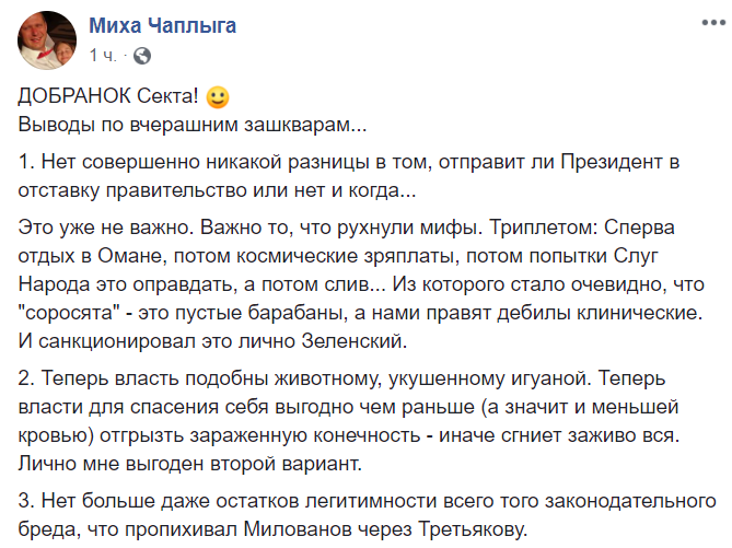 "Посмотрел хроники Гончарука. Не думал, что все настолько печально. Дело даже не в попытке обмануть Президента. И не в желании усадить его в тёплую ванну. Беда в отсутствии стратегии. Они тупо сидели и сочиняли сказочки для лохов. Они не понимают, куда плывёт наш корабль. И мне страшно быть его пассажиром. У нас таки совершенно слабый премьер. Раньше у меня были только предположения на этот счёт. Мягкий, без позиции. С руководством НБУ говорил как студент с преподами. Он даже не пытался разобраться в причинах ревальвации гривны, которая привела к дыре в бюджете. Но заискивающе интересовался, "как мы будем это объяснять".