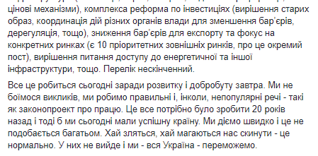 "Я поддерживаю премьер-министра. Алексей - лучший премьер-министр за всю историю Украины. И я это докажу вам фактами. Нет коррупции в правительстве, нет дерибана позиций, нет дерибана бюджета, нет дерибана государственных предприятий.