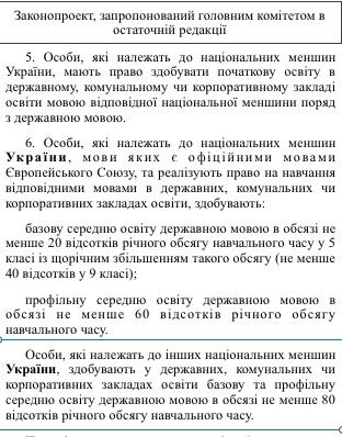 Украинские депутаты проигнорировали рекомендацию Венецианской комиссии не делать разницы между языковыми правами меньшинств, имеющих корни в Евросоюзе и остальными, что эксперты посчитали дискриминацией. Также депутаты решили не продлевать срок адаптационного периода при переходе на украиноязычное обучение.