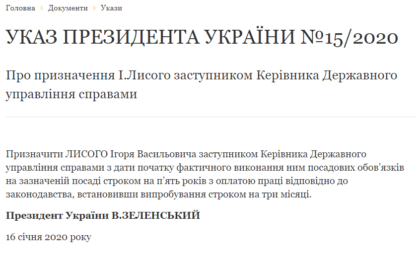 Сегодня, 16 января, президент Украины Владимир Зеленский издал два указа о назначении заместителей руководителя Государственного управления делами Украины. Указы были опубликованы на сайте президента.