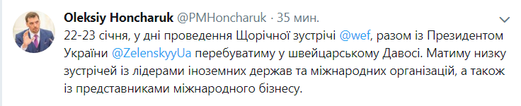 О своей поездке в Давос Гончарук сообщил в микроблоге Twitter.