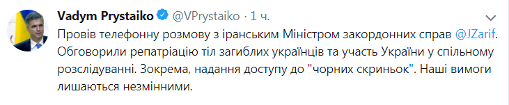 Между тем глава МИД Украины Вадим Пристайко сообщил в Тwitter, что по телефону обсудил репатриацию тел с иранским министром иностранных дел Мохаммадом Джавадом Зарифом.