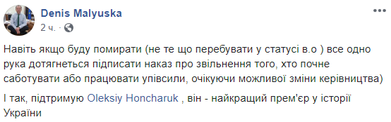 Министр юстиции Денис Малюська, который выписал себе премий почти на дюжину окладов, считает Гончарука лучшим премьером в истории Украины. Свою поддержку он выразил, написав пост в Facebook.