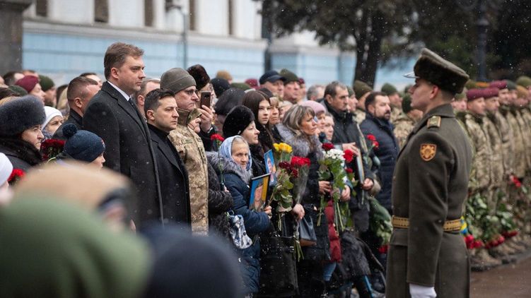 В понеедльник 20 января президент Украины Владимир Зеленский принял участие в мероприятиях у здания Министерства обороны в память о военнослужащих, погибших в боях за донецкий аэропорт.