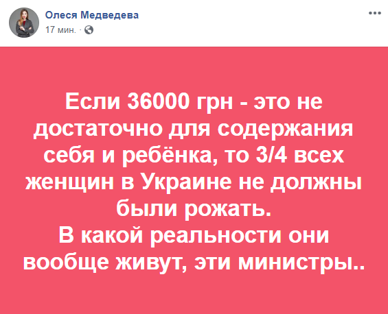 "Если 36000 грн - это не достаточно для содержания себя и ребёнка, то 3/4 всех женщин в Украине не должны были рожать. В какой реальности они вообще живут, эти министры...", задается вопросом журналист "Страны" Олеся Медведева.