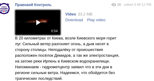 "Неподалёку от происшествия расположен посёлок Демидов, а так же электростанция, на затоке реки Ирпень в Киевском водохранилище", - говорится в сообщении на канале, под которым размещено видео.