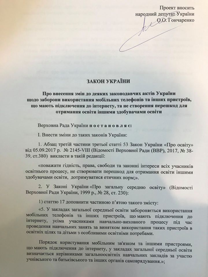 Об этом Алексей Гончаренко написал в Facebook. Он также приложил текст законопроекта.