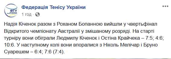 Украинская теннисистка Надежда Киченок в миксте с индийским теннисистом Роханом Бопанна пробилась в четвертьфинал престижного турнира Australian Open.