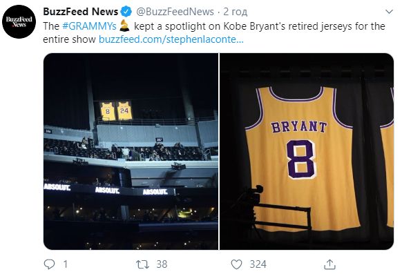 А во время вручения премии Грэмми, которая прошла вчера, в память о Брайанте вывесили на всеобшее обозрение его форменные майки.