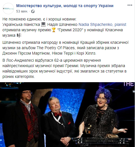 Зато в Минкульте сообщили, что есть и хорошие новости - украинская пианистка получила одну из номинаций Grammy 2020.