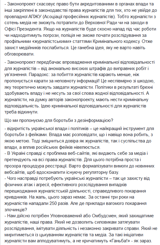 - Власть хочет создать подконтрольное общественное объединение АПЖУ (ассоциация профессиональных журналистов). Его руками предлагается наказывать нелояльных к власти журналистов и медиа. Это недопустимо. Такого нет ни в одной демократической стране.