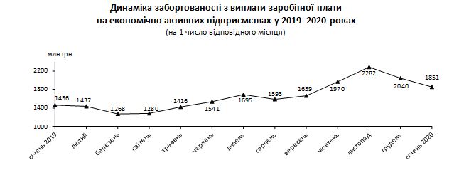 По ее данным, в декабре прошлого года сумма задолженности по зарплате экономически активных предприятий уменьшилась на 9,3% и на 1 января 2020 года составила 1,851 млрд грн.