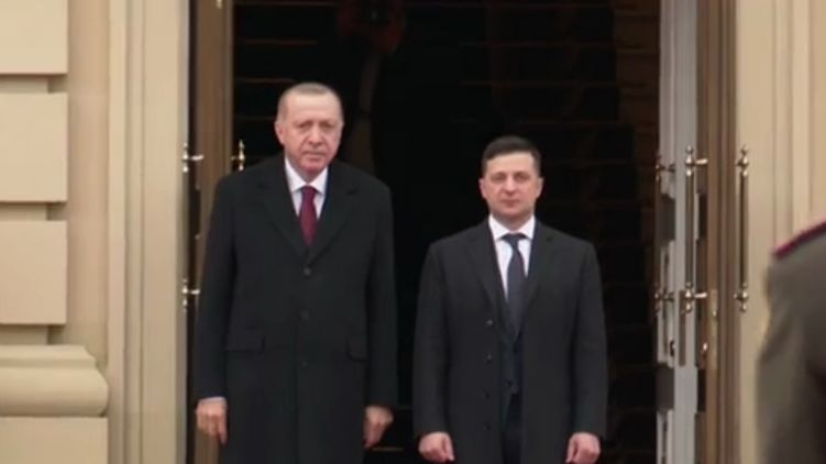 Во время встречи прозвучали гимны Украины и Турции, после чего Эрдоган подошел к микрофону, который стоял перед почетным караулом, и поздоровался словами "Слава Украине!".
