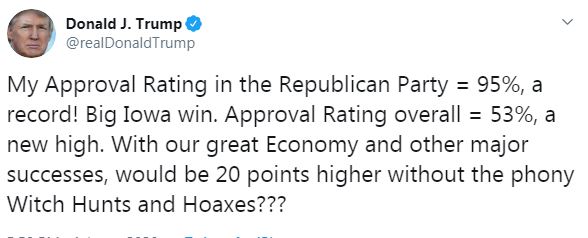 "Мой рейтинг одобрения в Республиканской партии - 95%. Большая победа Айовы. Это рекорд! Общий рейтинг одобрения - 53%. Это новая высота. С учетом нашей величайшей экономики и других крупных успехов могло бы быть на 20 процентных пунктов выше, если бы не лицемерная охота на ведьм и измышления?" - написал он во вторник.
