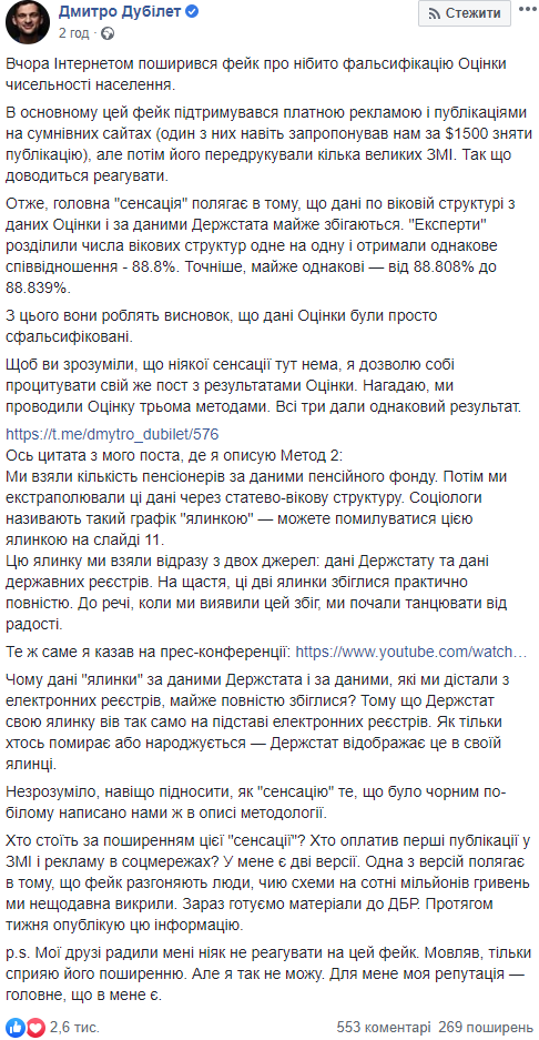 "Вчера по Интернету распространился фейк о якобы фальсификации оценки численности населения. В основном этот фейк поддерживался платной рекламой и публикациями на сомнительных сайтах (один из них предложил нам за $1500 снять публикацию), но затем его перепечатали несколько крупных СМИ. Так что приходится реагировать.", - пишет Дубилет.