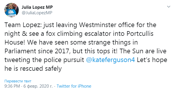 "Просто покидаю ночью Вестминстерский офис и наблюдаю, как лиса поднимается по эскалатору в Portcullis House! Мы видели некоторые странные вещи в парламенте с 2017 года, но это топ в списке!" - написала Лопес.