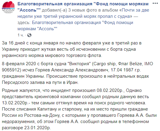 "За 16 дней с конца января по начало февраля уже в третий раз в Украину приходит жуткая весть об исчезновении с борта судна украинского моряка мирового торгового флота. 8 февраля 2020 с борта судна "Виктория" (cargo ship, флаг Belize, IMO 9065912) исчез Горяев Александр Александрович, 17.04.1987 г.р. гражданин Украины. Происшествие произошло в нейтральных водах Персидского залива на пути в Иран", - сообщили в фонде.