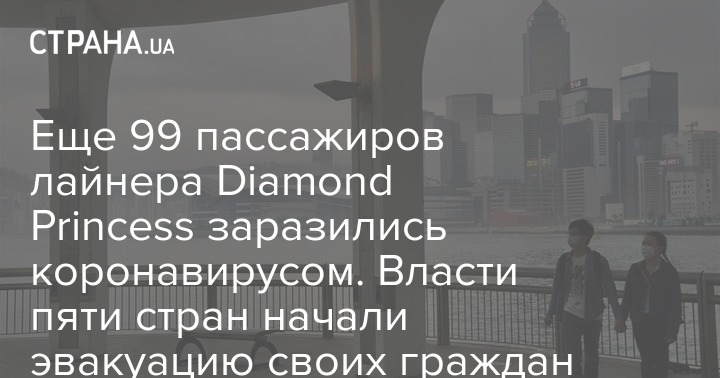 Кроме того, сегодня стало известно, что власти Канады, Южной Кореи, Гонконга, Италии и Австралии начали эвакуировать своих граждан, которые прошли двухнедельный карантин на Diamond Princess. Об этом сообщают Nikkei и The Japan Times.