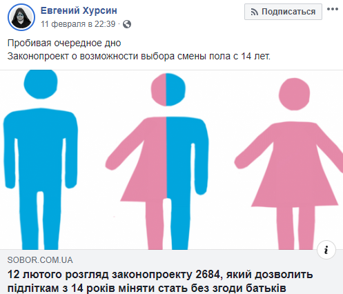 "Пробивая очередное дно. Законопроект о возможности выбора смены пола с 14 лет" - написал блогер Евгений Хурсин.