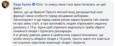 "Конечно, это ложь! Просто качественный вброс дескридитации моей фракции и меня лично перед местными выборами. Законопроект я еще перед новым годом зарегистрировала и он вовсе не об изменении пола, а о возможности людям получать медицинскую помощь с 14 лет. Ведь чтобы получить медуслуги надо выбрать семейного врача и подписать декларацию.