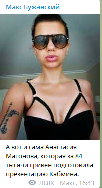 "Охх. Какой зашквар несется в сети по поводу контракта между Magonova & Partners и Кабмином. Друзяшечки, спасибо за мои фото в купальнике, которое опубликовали в сети. Я там хорошо получилась. Купальник мне, кстати, папа подарил. Я даже не уверена, что мне на фото есть 18. Так что аккуратней там.
