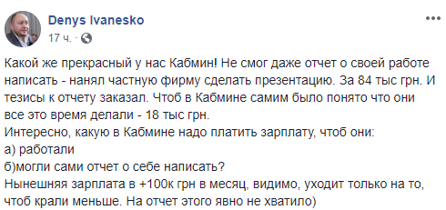 "Какой же прекрасный у нас Кабмин! Не смог даже отчет о своей работе написать - нанял частную фирму сделать презентацию. За 84 тыс грн. И тезисы к отчету заказал. Чтоб в Кабмине самим было понято что они все это время делали - 18 тыс грн.