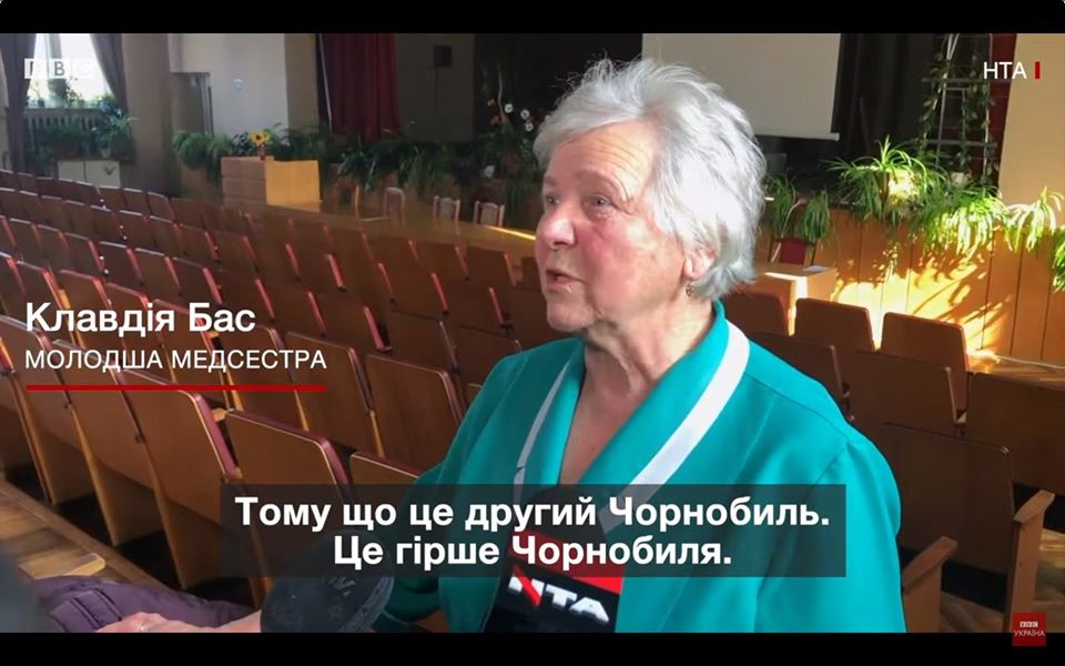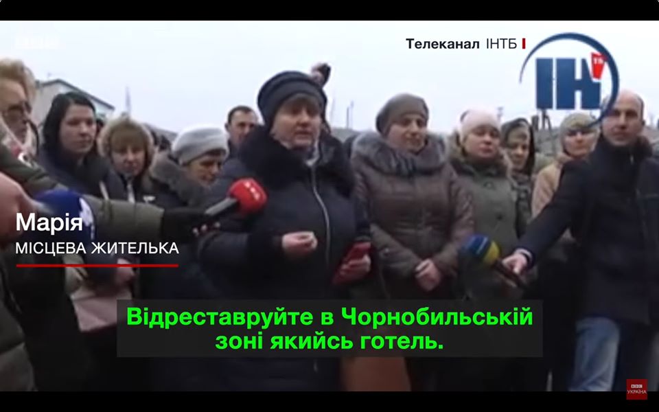 Протесты населения и медработников широко освещались по телевидению. На кадрах, приведенных ниже, видно, что люди баррикадируются шинами, призывают направить эвакуированных в Чернобыль и даже молятся, как будто отгоняя нечистую силу.