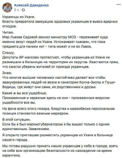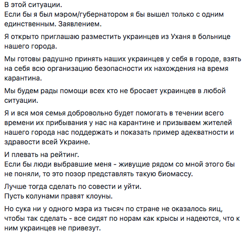 Я открыто приглашаю разместить украинцев из Уханя в больнице нашего города.